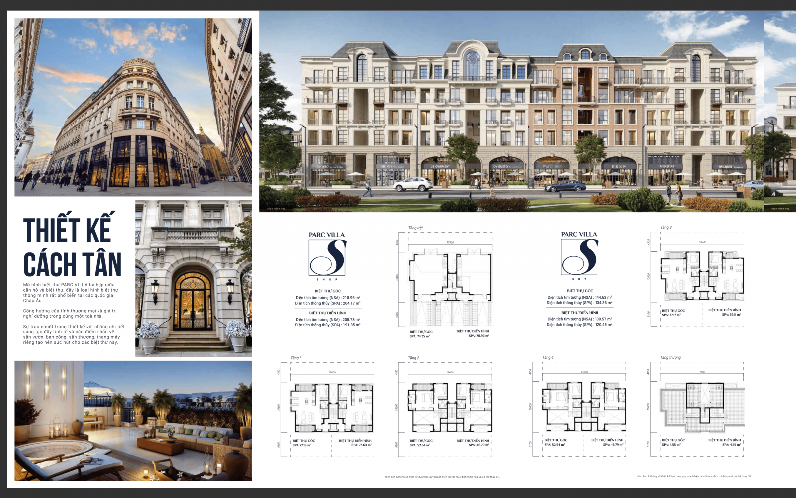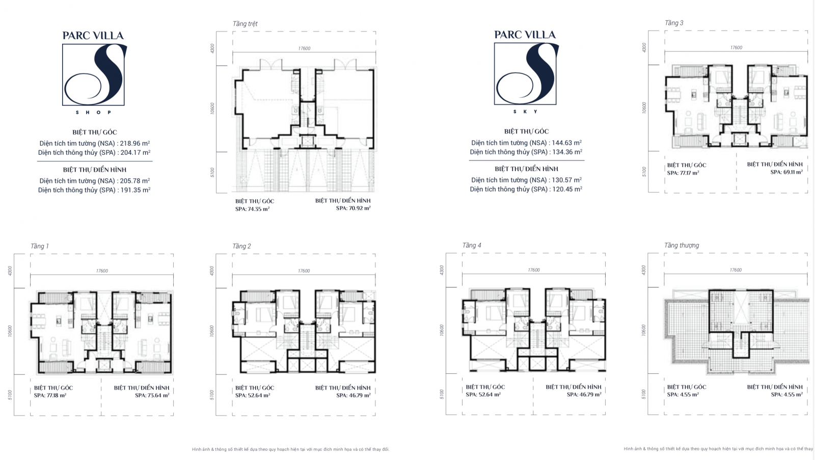 404 căn Villa Shophouse xây dựng 5 tầng + sân thượng, diện tích tiêu biểu 8,8 × 10,6m (~218m²).