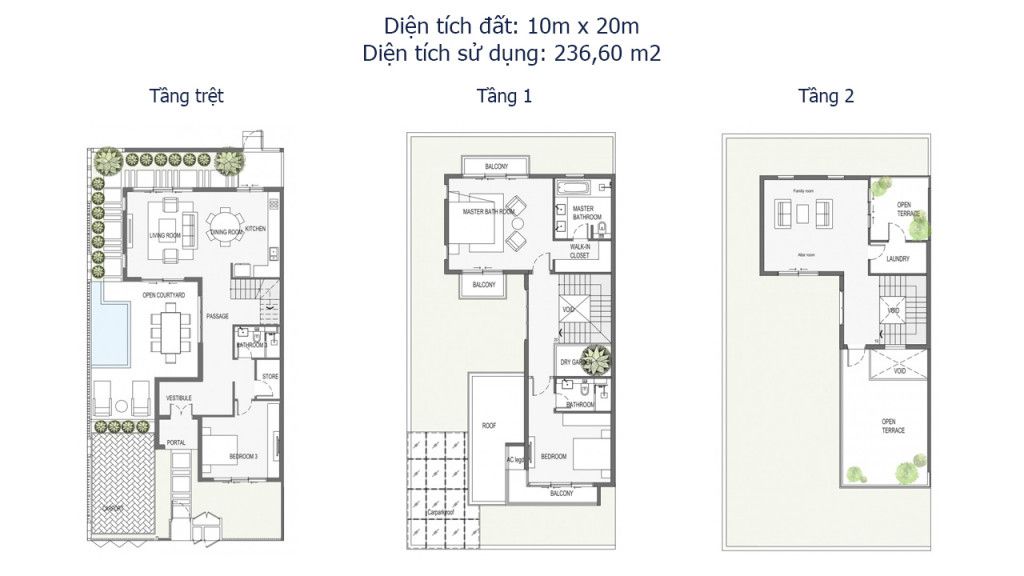 Thiết kế 1 trệt + 2 lầu với sân vườn trước/sau, phù hợp an cư hoặc nghỉ dưỡng.